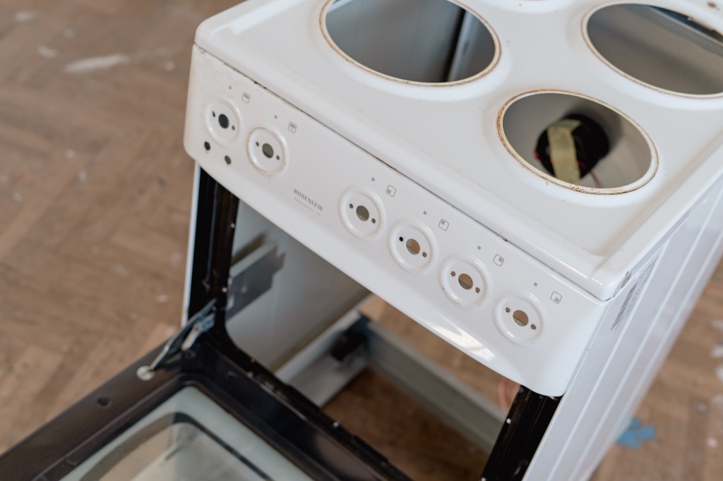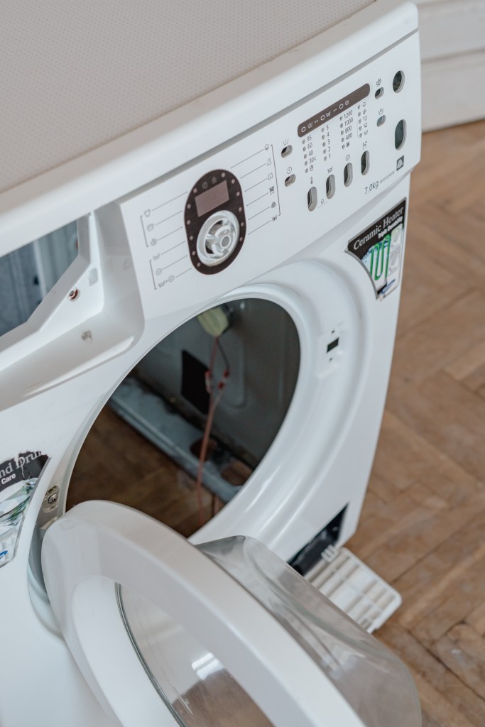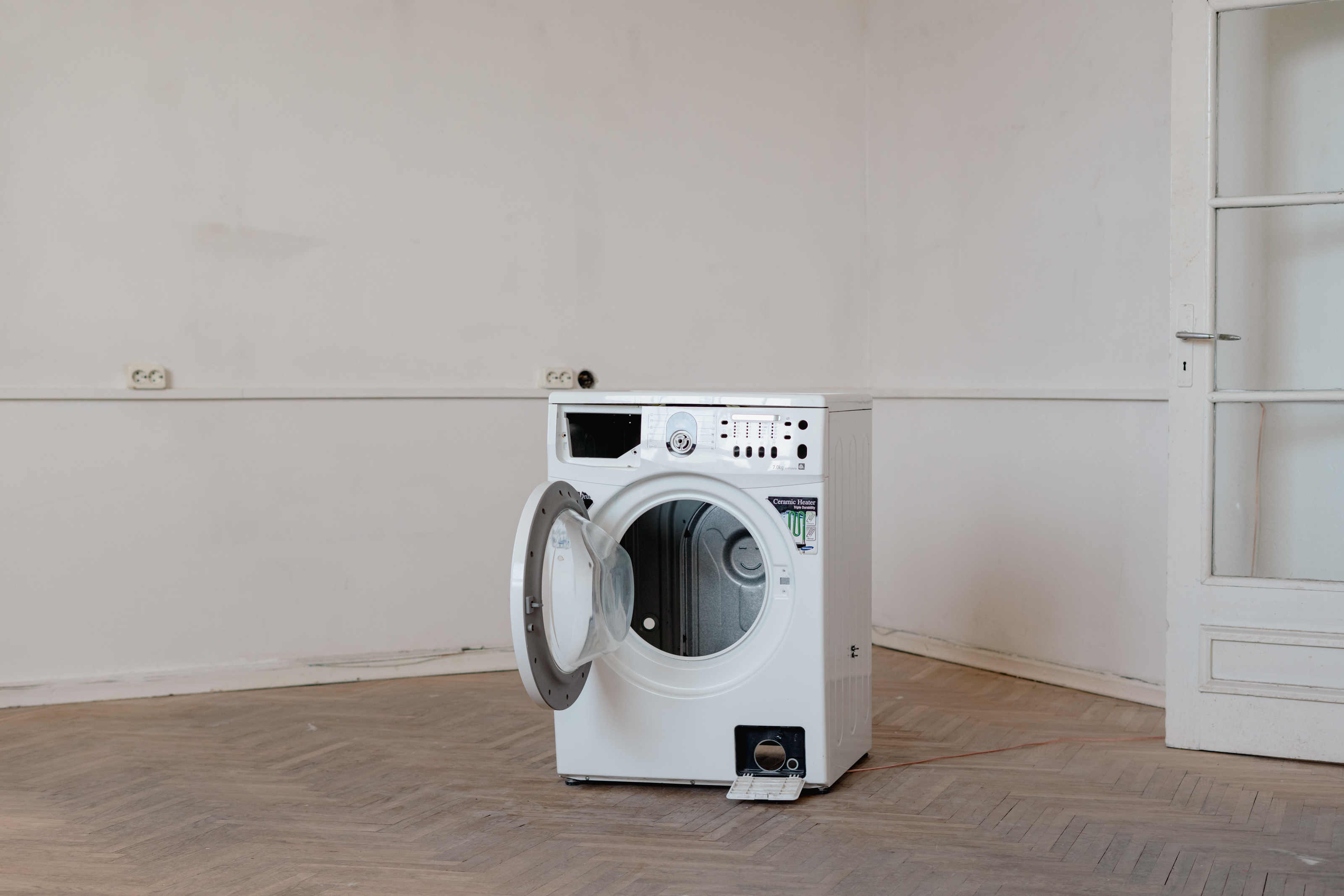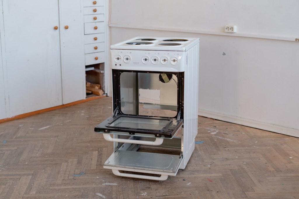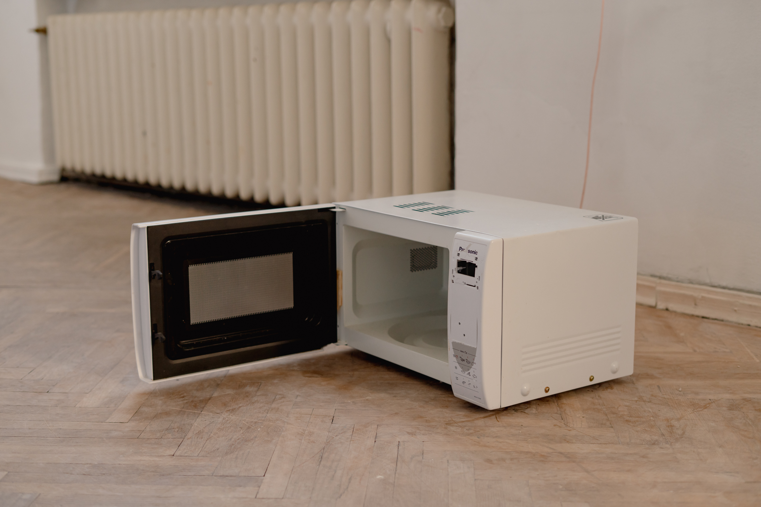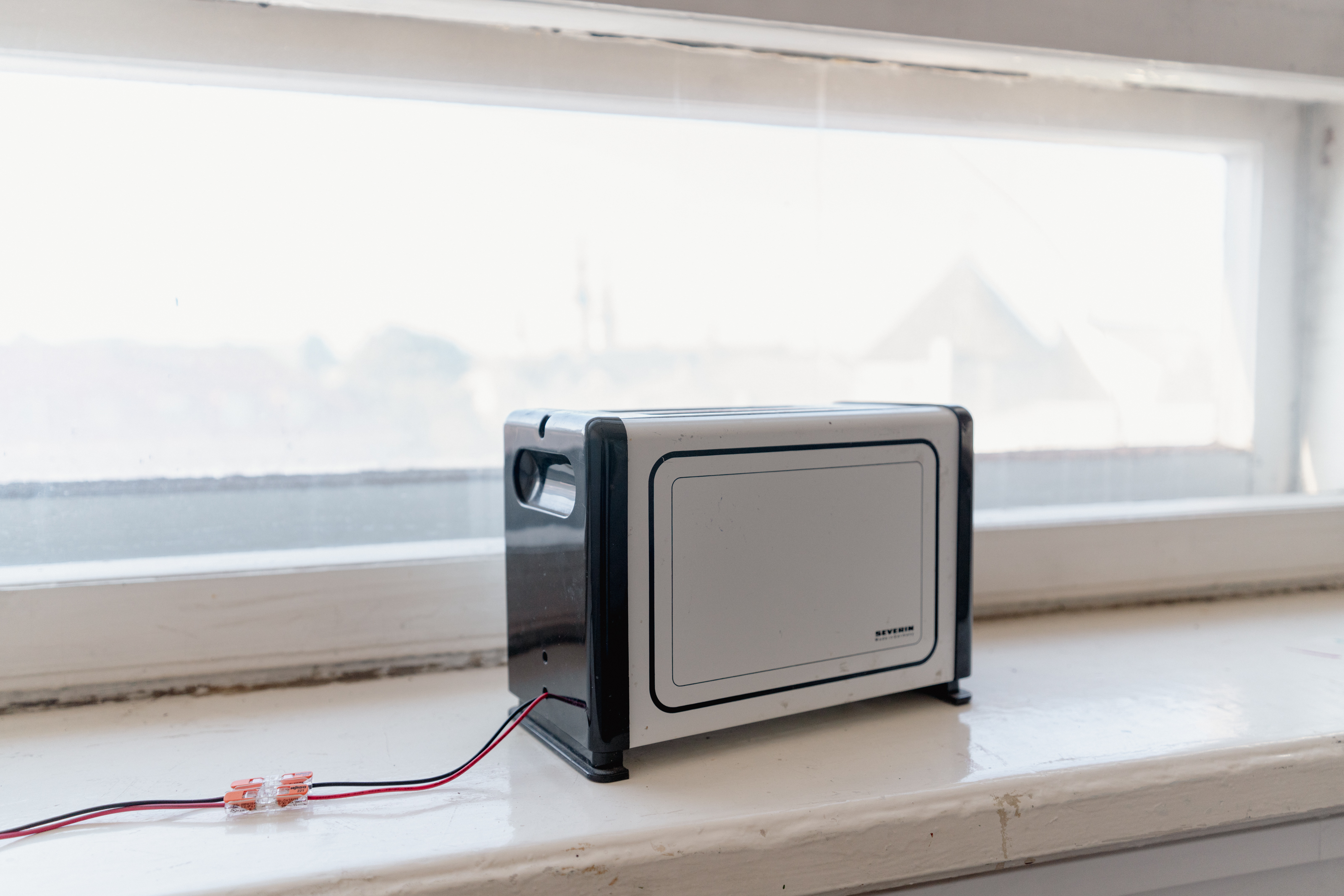 The visitor sees four household items in the room — a washing machine, an electric stove, a microwave oven, and a toaster. The interiors of these items have been removed for acoustic reasons, and each one has a vibration speaker attached to it. Together, they perform a piece of music, each playing its own part — the washing machine provides the bass, the stove acts as a drum, and so on.