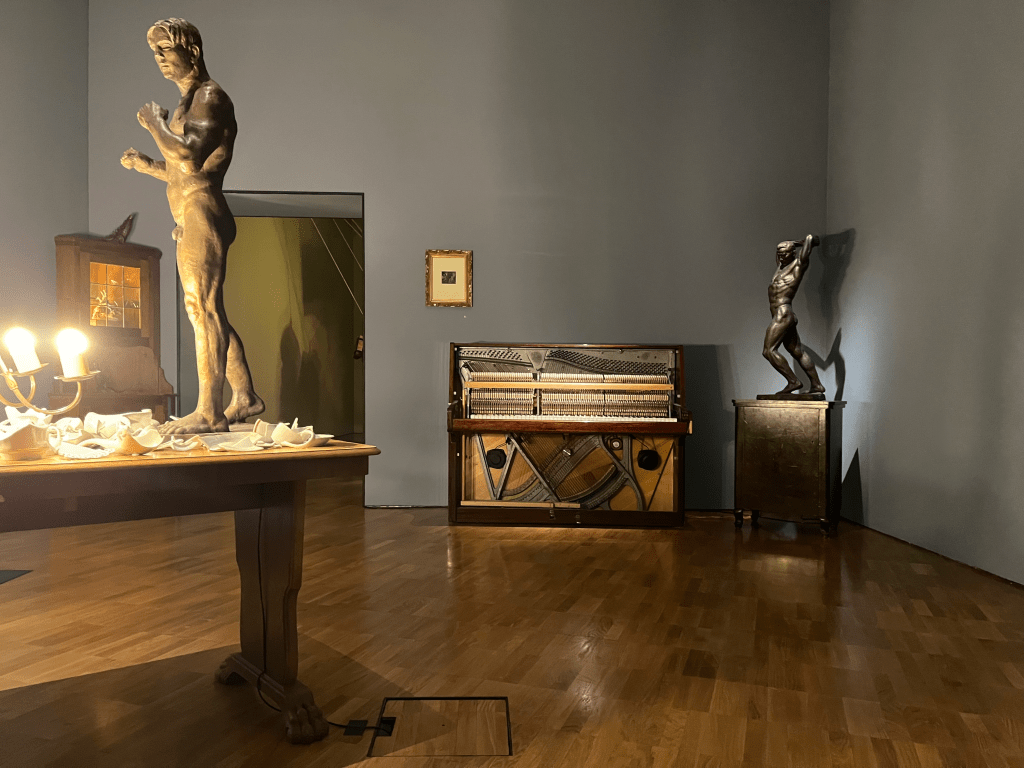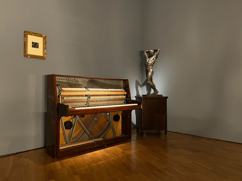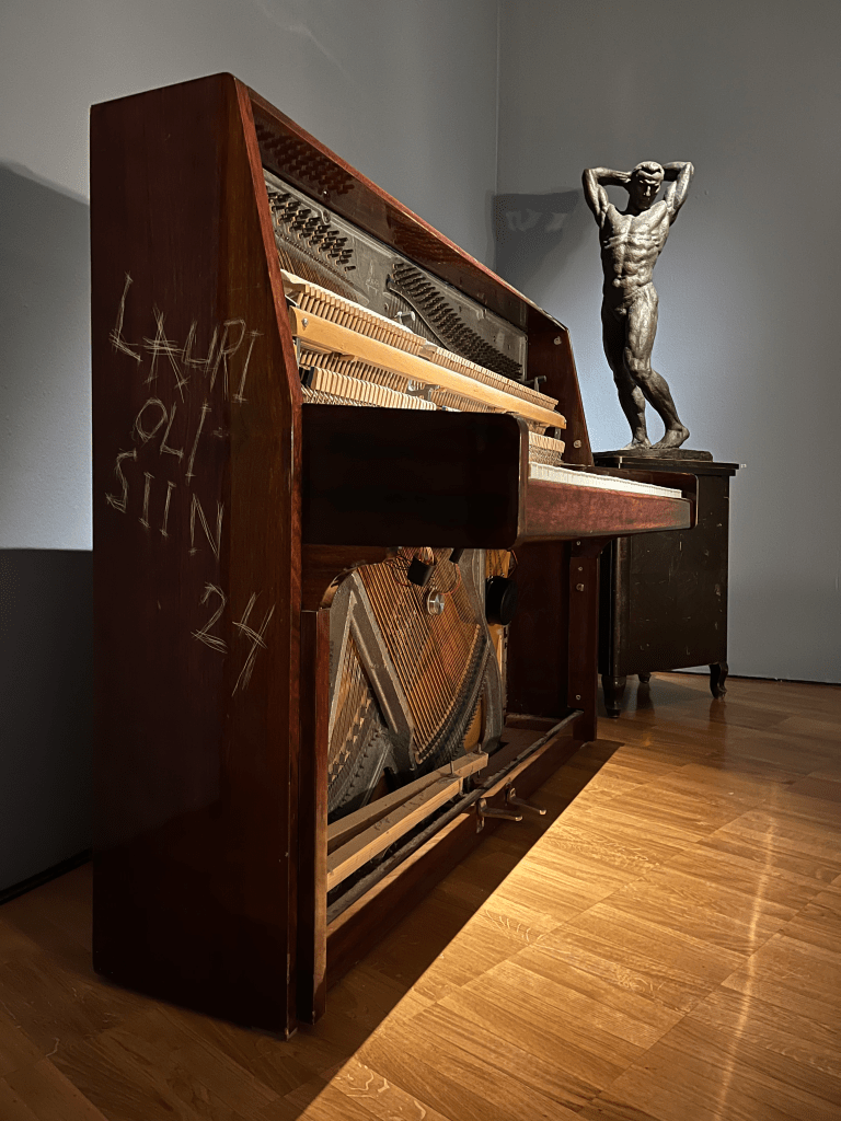“I went down to the sculpture collection at KUMU to select works for my exhibition, and the sculpture collection director, Juta, pointed to a plaster hand, saying, ‘Look, this would sit well on top of a piano.’ I replied that I didn’t have a piano. Juta was surprised, ‘How could you not have a piano? A piano was the symbol of a bourgeois home during the first Estonian era. Every self-respecting middle-class person had to have one, whether they played it or not.’ Well, then I needed a piano. But why should the piano just sit there idly, serving as a pedestal for a plaster hand? Better for it to play sounds.” – Urmas Lüüs, exhibition main artist