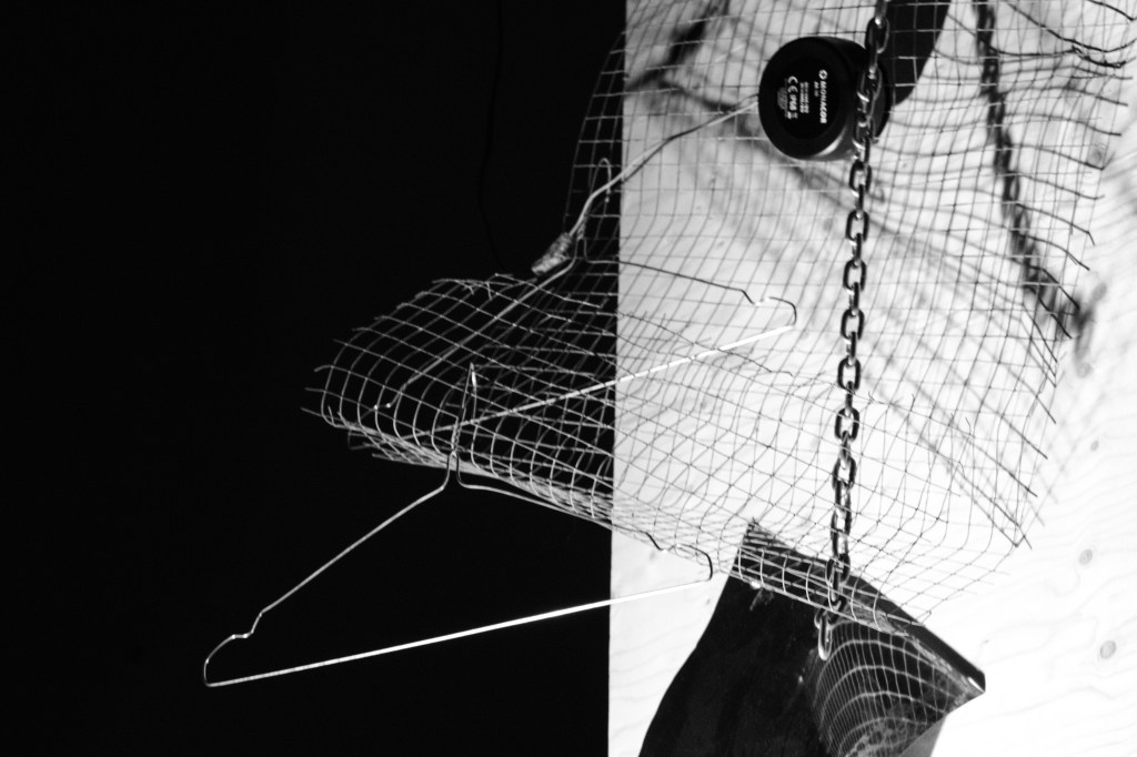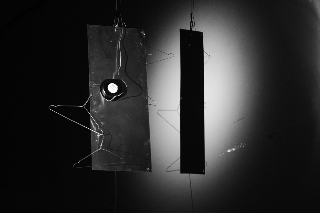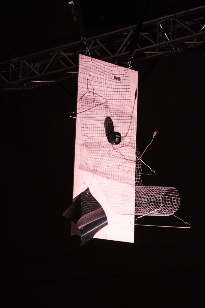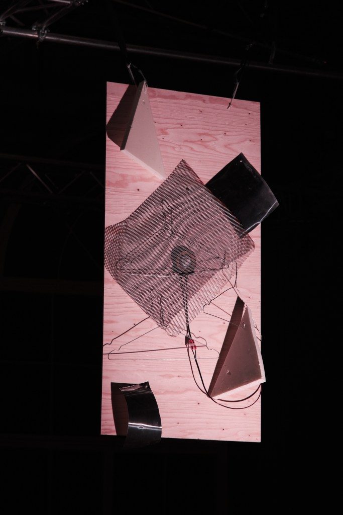 In Spruce 2, the central elements of the performance, along with the theatre hall itself, were three pieces of spruce plywood, each with various found objects and vibration speakers attached. Additionally, a speaker element was placed at the center of the stage floor, which is also made of spruce. Flanking the audience on both sides were two thin metal sheets, also with attached found objects and bass vibration speakers. Along with the vibration speakers, the venue’s PA system, specifically the subwoofers, was used at certain points in the sound composition to create a deep rumble, making the entire room and its contents vibrate.